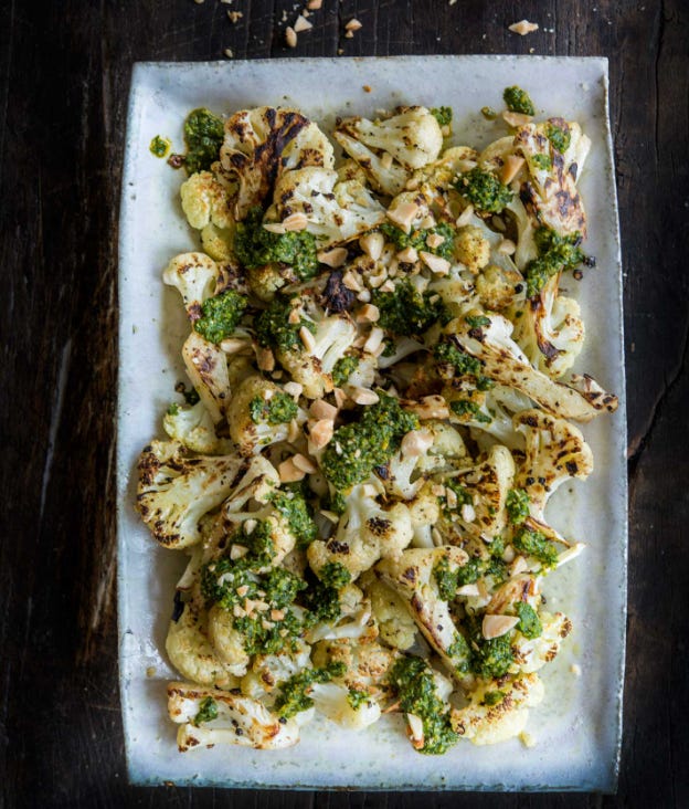 Roast the cauliflower the same way and serve it with tahini sauce instead: three tablespoons tahini, juice of one lemon, one small garlic clove grated, a pinch of salt, enough cold water to make it pourable. It is a different dish and equally good. Both have been made in my kitchen more times than I can count.