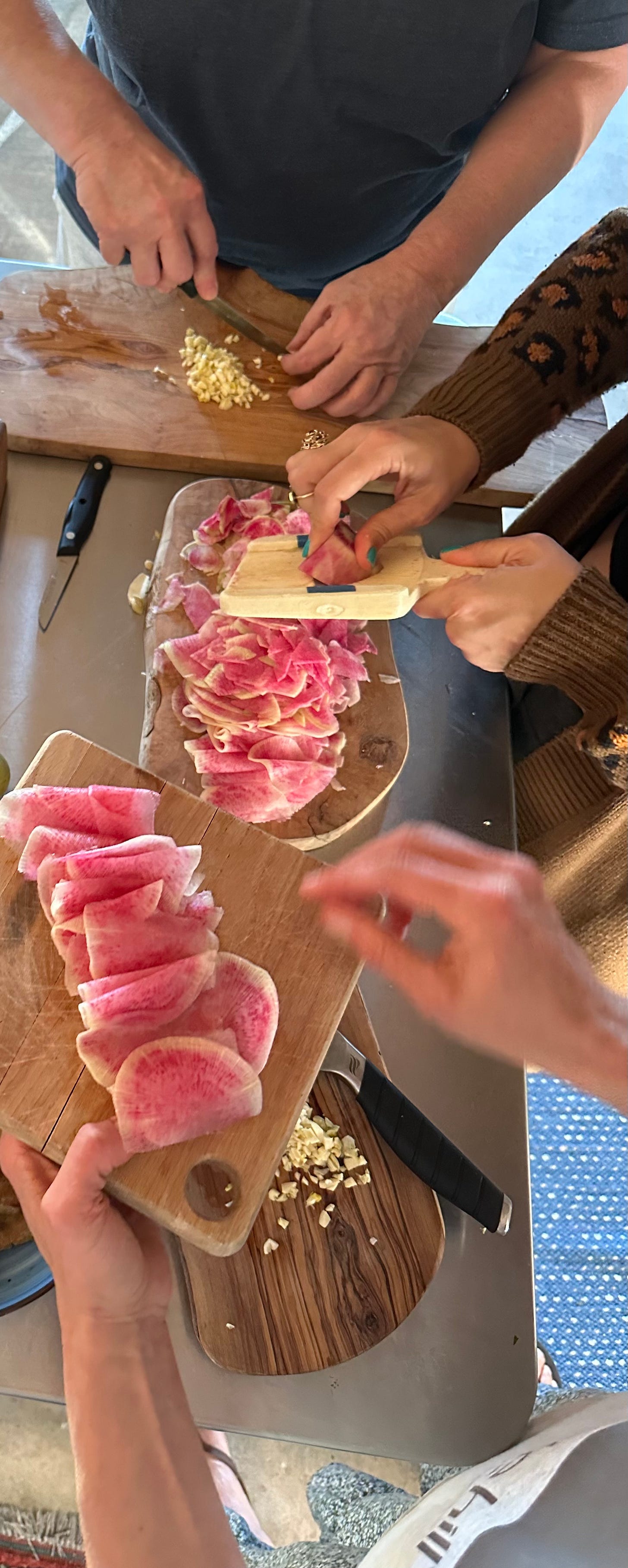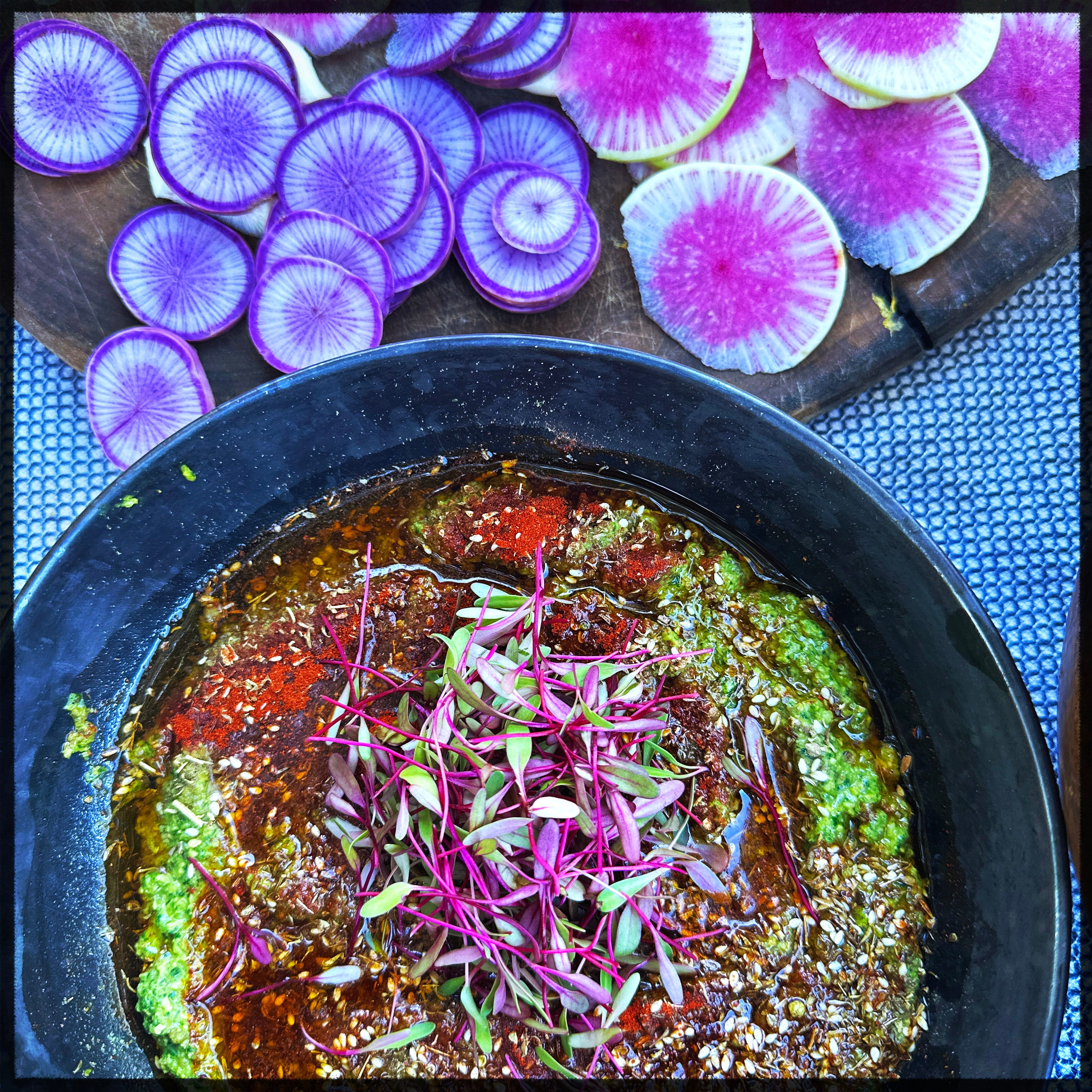 All roads lead to through lines and one is seasonal. The light is crystalizing, flowers brighten the landscape, peas are popping and it is time to plant the basil! It is Spring. I have been adorning my table with fresh peas blended into a “hummus” with tahini and Meyer lemon juice and garlic with a good measure of cayenne for a kick. A tabouli that is mostly parsley, the way it should be, with spring onions and quinoa and lemon. This is a nutritional powerhouse designed for recovery and emerging research suggests parsley activates stem cells. Good olives, the ones that are naturally fermented and a probiotic food that make the full journey to your large intestine to repopulate the microbiota. Colorful, crisp vegetables to dip that have something to say for themselves: celery, watermelon radish, jicama, carrots. Put it in the center and let people eat slowly and with their hands. It takes thirty minutes to make and about ten minutes to understand why you will make it again, and again and again. This kind of food delights your tastebuds and nourishes your cells and leave you satisfied, whole and wondering why you don’t have more room in your stomach to eat. Ah, but there is always next time.